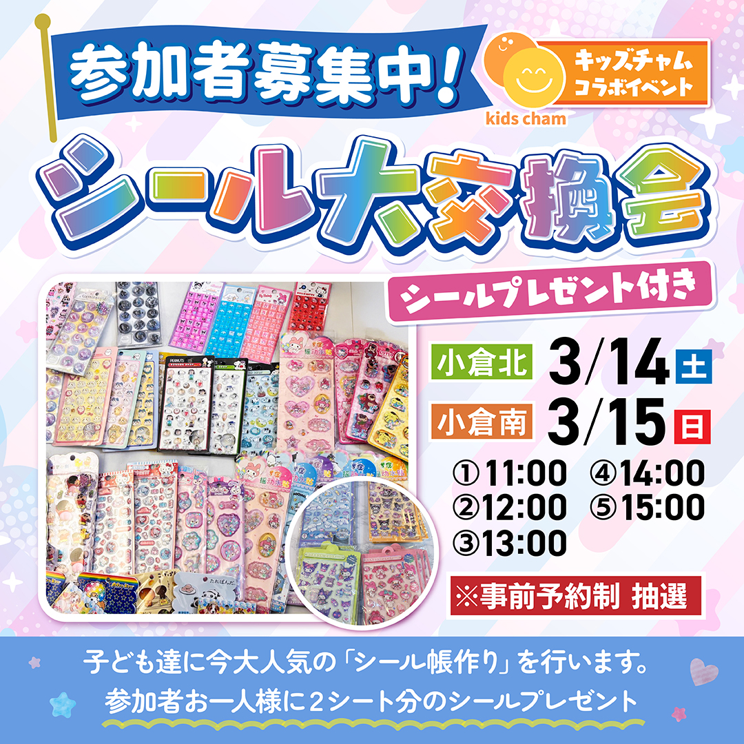 3/14(土)は小倉北会場、3/15 (日)は小倉南会場で、「シールプレゼント&シール大交換会」を開催。