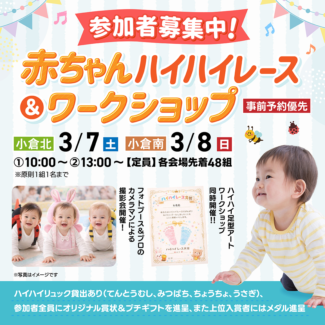 3/7(土)は小倉北会場、3/8 (日)は小倉南会場で、「赤ちゃんハイハイレース&ワークショップ」を開催。